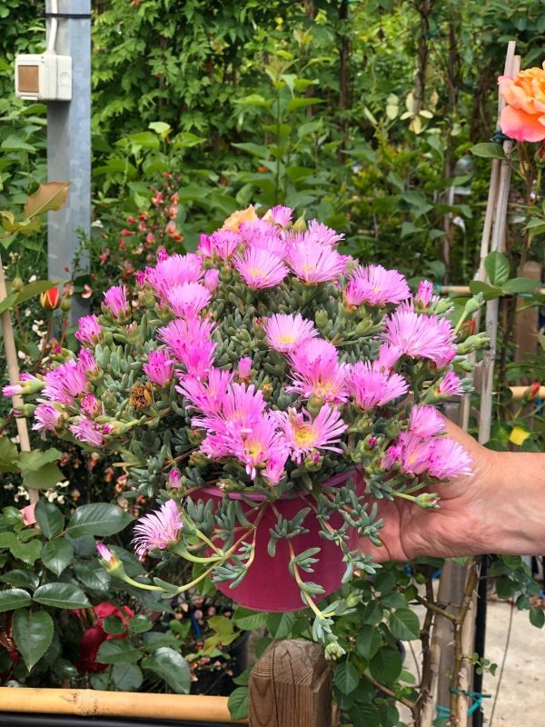 El Mesembriantemo (Lampranthus spp.) es una planta suculenta tapizante muy apreciada en jardinería por su floración abundante y colorida, con flores que van del rosa, violeta, rojo, amarillo al blanco. Es ideal para cubrir suelos, taludes, rocallas y bordes, aportando un efecto de alfombra floral durante la primavera y el verano.